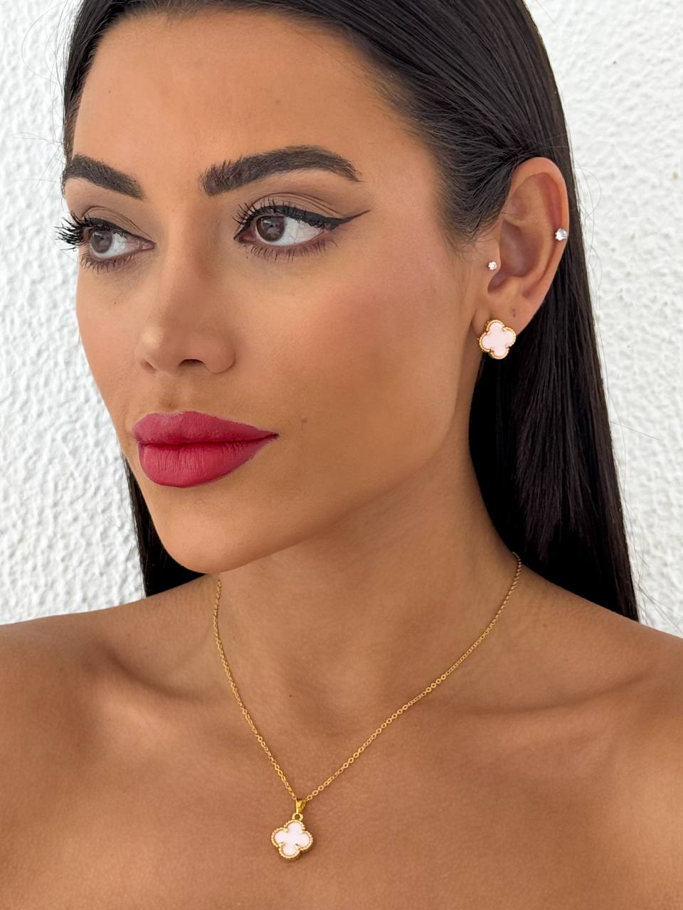 Conjunto Folheado Dourado Colar + Brinco Trevo Branco